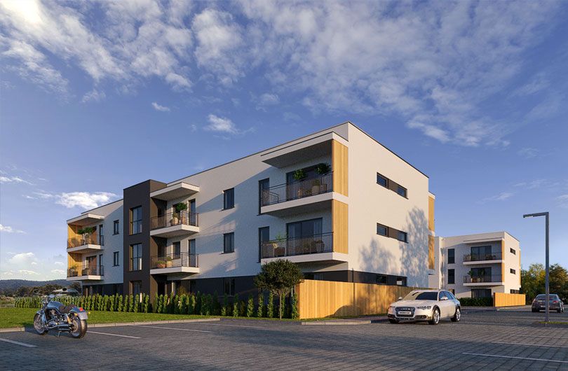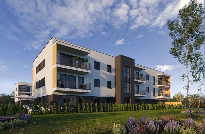 Projekt kameralnego osiedla 3 budynków mieszkalnych wielorodzinnych na obrzeżach Płocka.